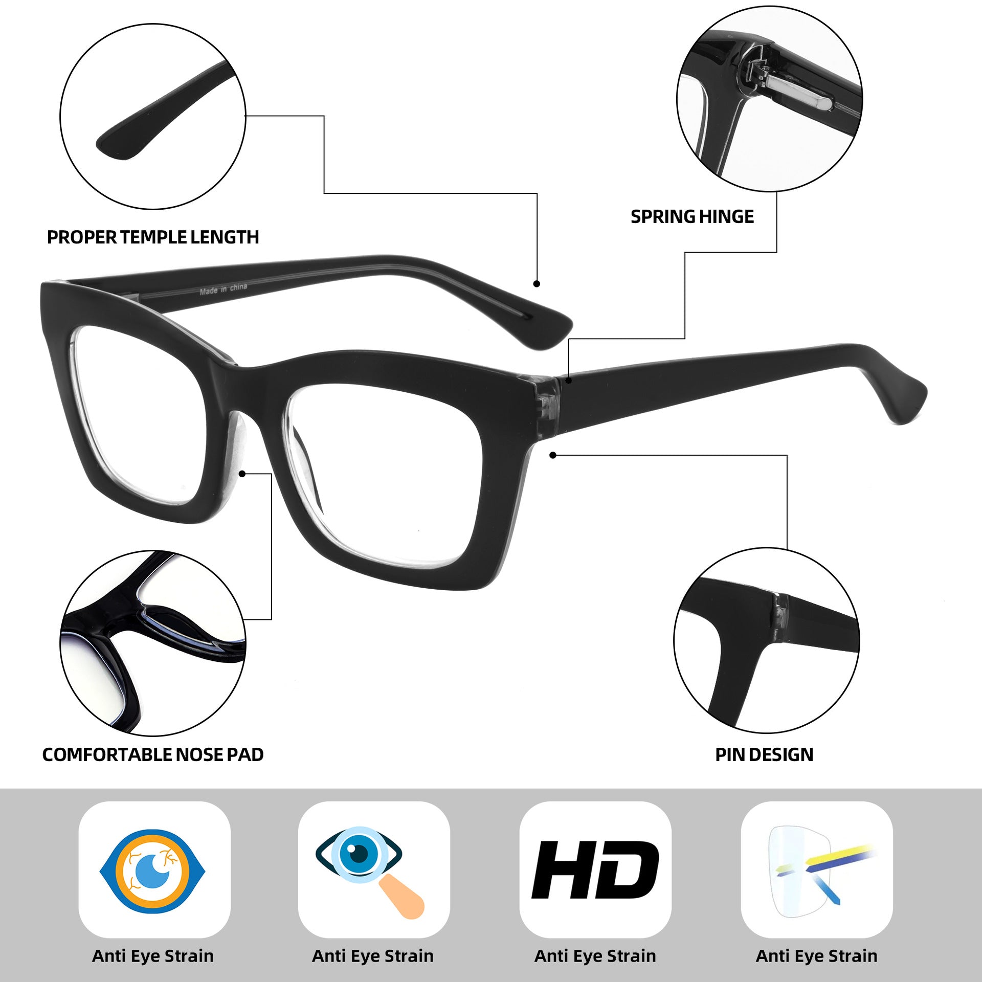 Texture and Detail: Experience unparalleled craftsmanship with our classic square cat-eye blue light blocking reading glasses. Every aspect of these glasses is meticulously crafted. from the intricate detailing on the frame to the smooth finish that exudes elegance and sophistication. Elevate your style while protecting your eyes from harmful blue light.