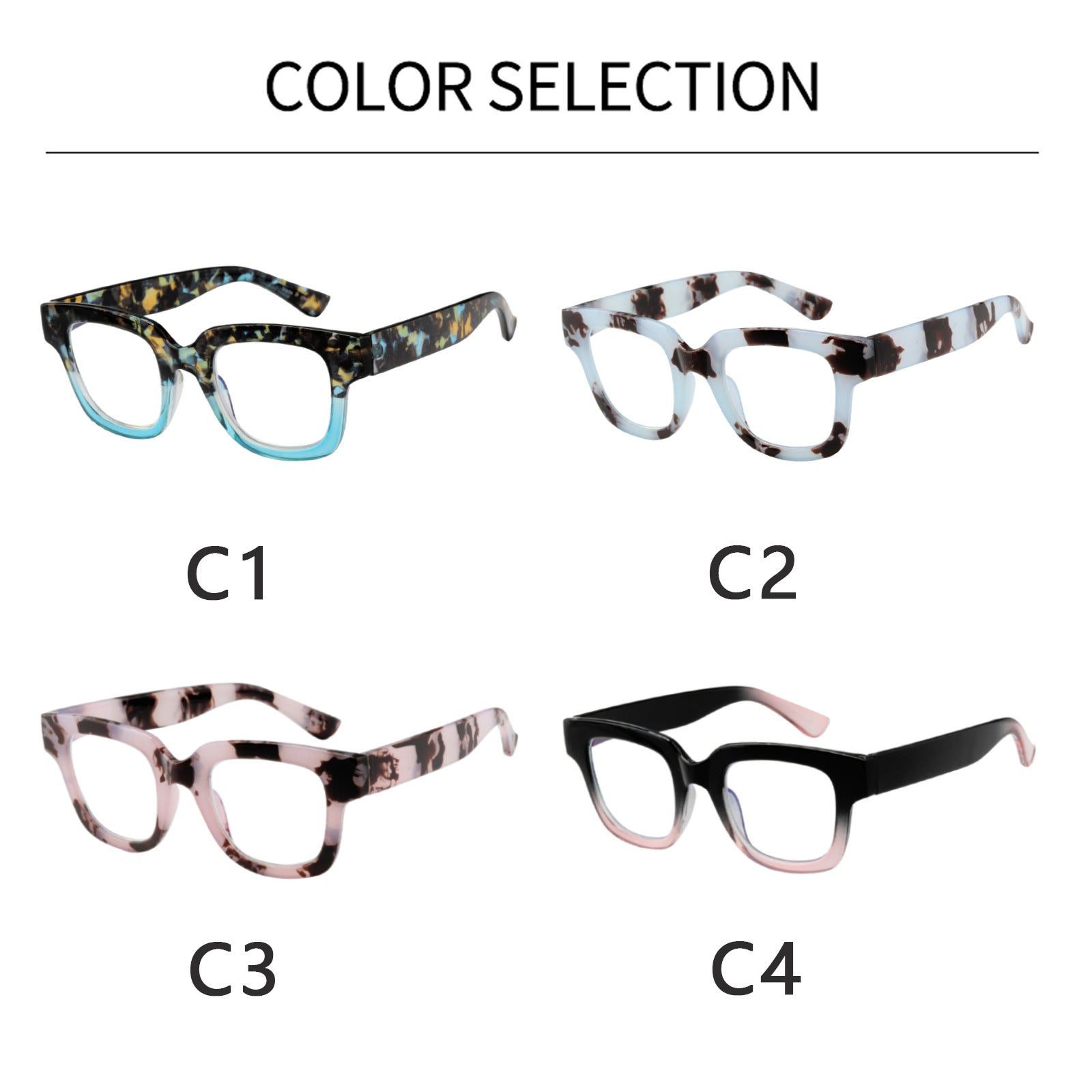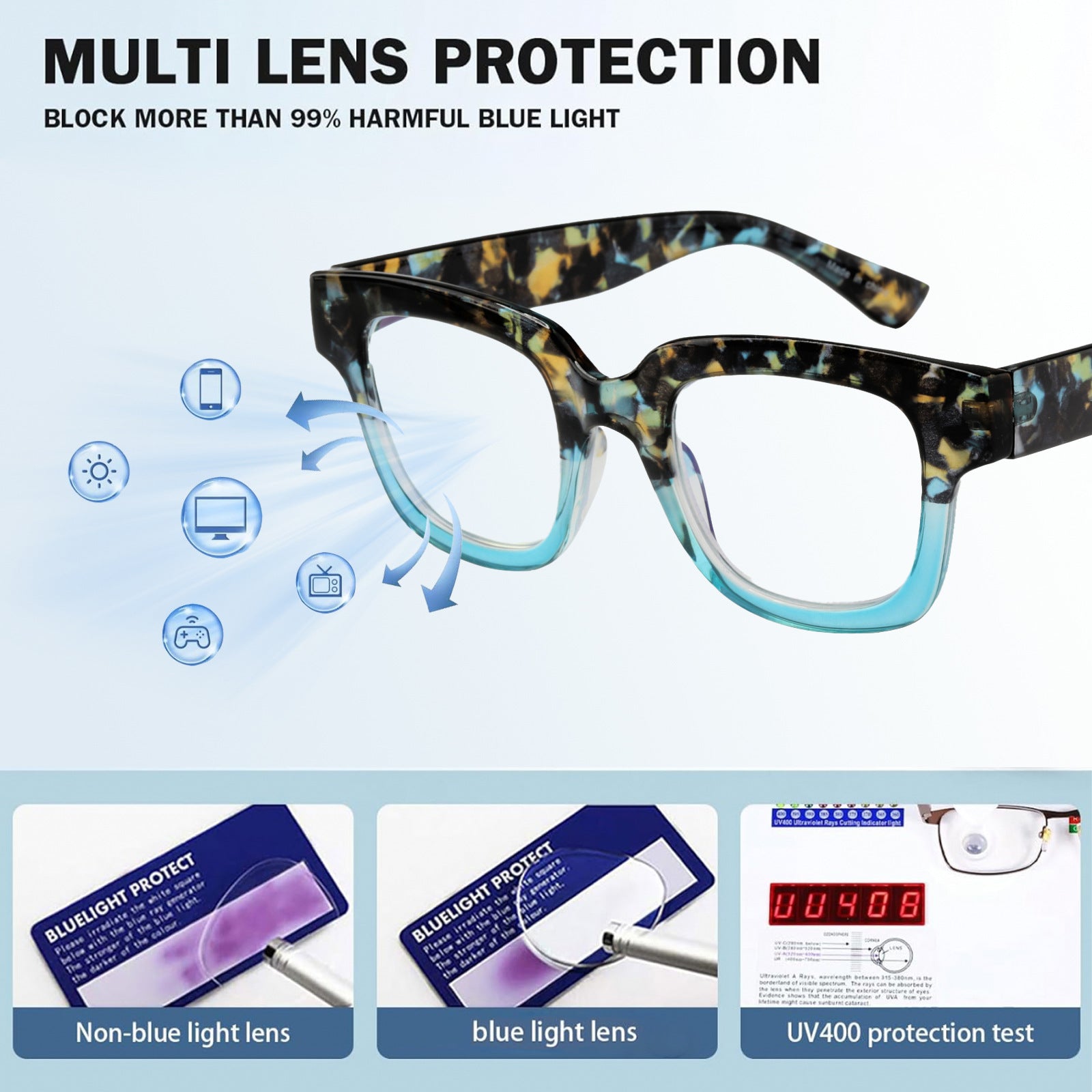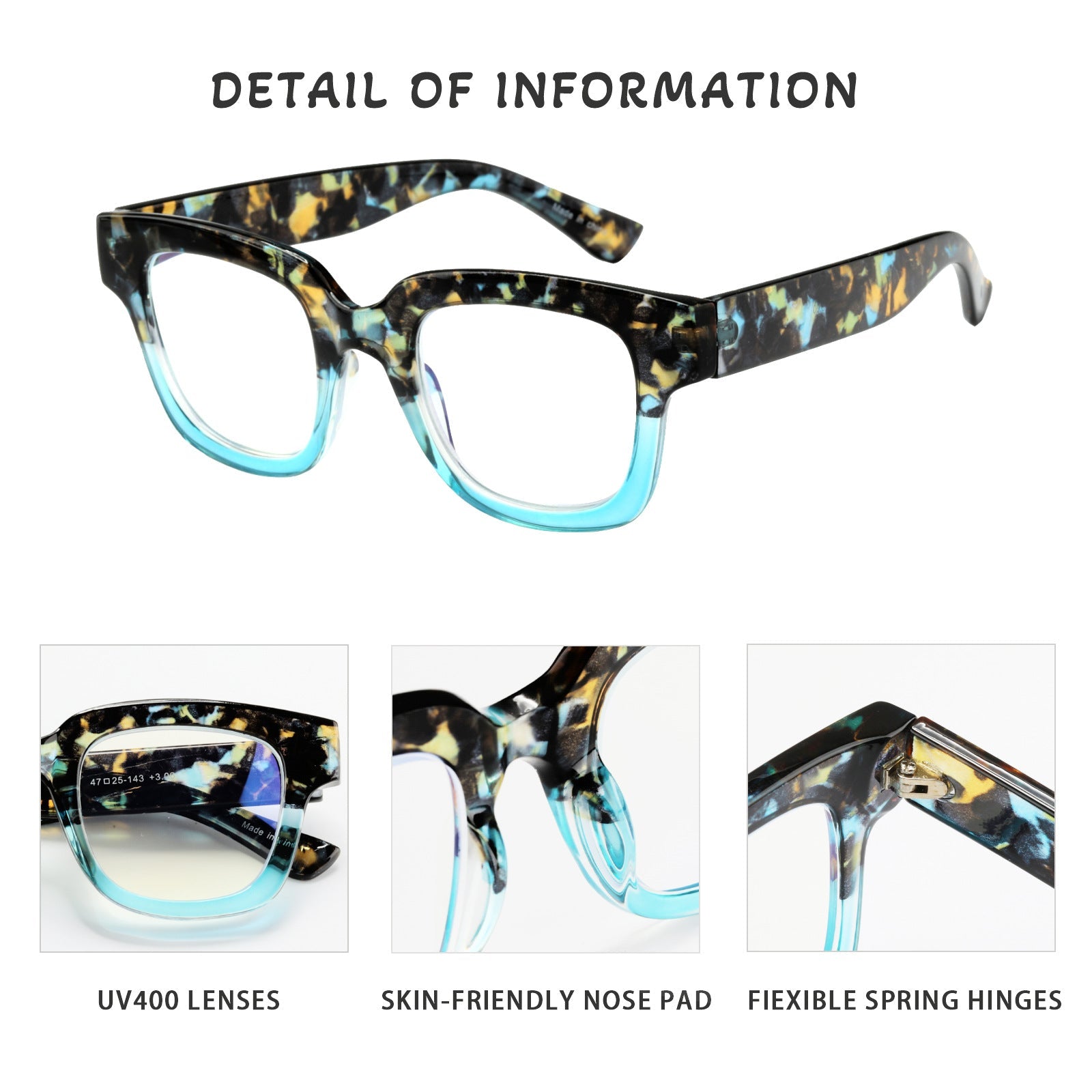Blue Light Protection: Protect your eyes from the harmful effects of blue light emitted by digital screens with our Fashionable Oversized Patterned Blue Light Blocking Reading Glasses. Featuring advanced lens technology. these glasses effectively filter out blue light. reducing eye strain and fatigue. allowing you to enjoy extended screen time with ease.