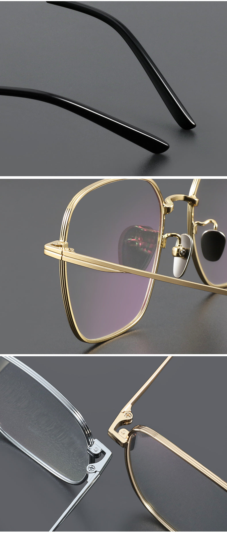 These stylish eyeglasses are made of polished and slender metal material. Featured with fashionable design. It is a good choice for man or women who are looking for a pair of fashionable eyeglasses.